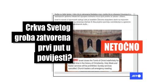Slika Iran Objavljeno 27. 03. 2026. Zatvaranje crkve u Jeruzalemu ponovno potiče neutemeljene tvrdnje o 'napadu na kršćane'