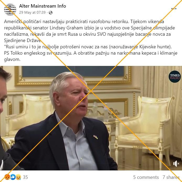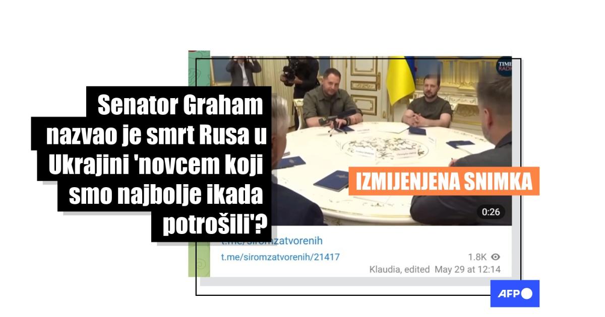 U kratkom videu koji je podijelilo ukrajinsko predsjedništvo, čini se da američki senator Lindsey Graham u razgovoru s ukrajinskim predsjednikom Volodimirom Zelenskim kaže "Rusi umiru. To je novac koji smo najbolje ikad potrošili" komentirajući podršku SAD-a Ukrajini u borbi protiv ruske invazije. No, na dužoj snimci razgovora vidi se da senator te dvije rečenice nije izgovorio jednu za drugom.
