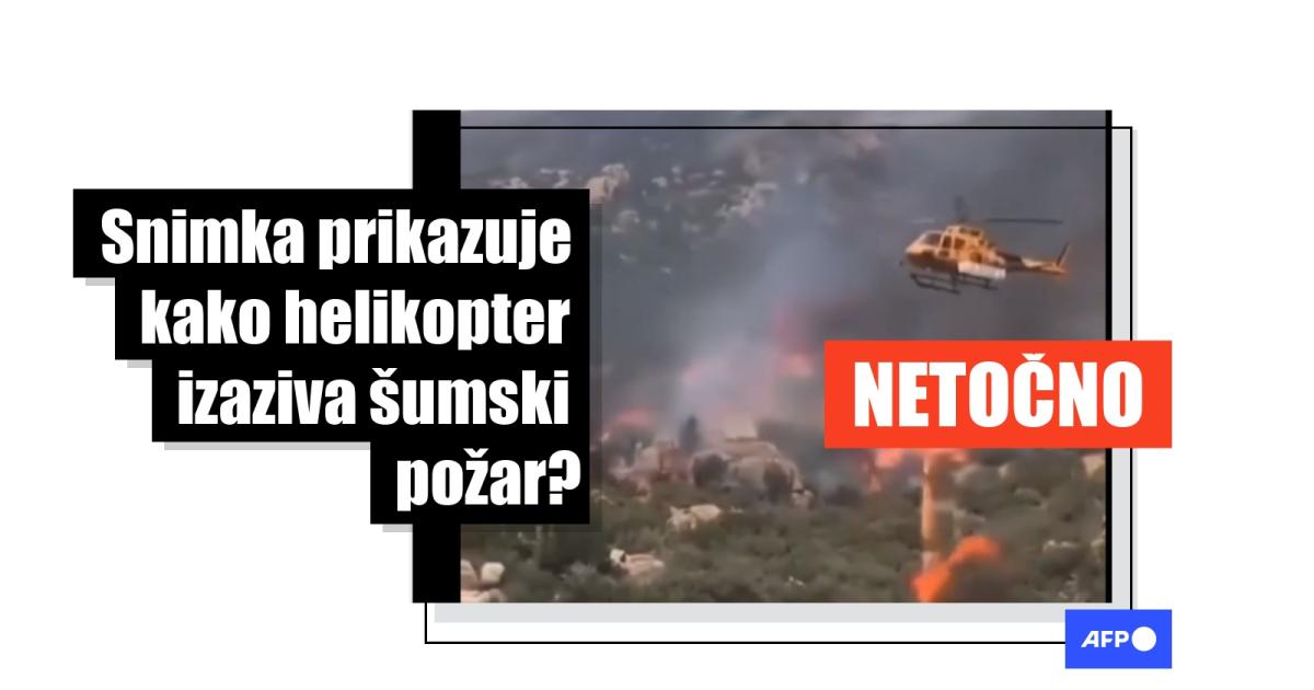 Video dug 11 sekundi, u kojem je prikazan helikopter u letu iznad šumskog požara kako ispušta plamen preko drveća, objavljen je na Facebooku 21. srpnja 2022. godine s tekstom na snimci koji glasi: "klimatske promjene". Objava je podijeljena više od 200 puta u manje od tri tjedna. Ista snimka je objavljena i ovdje uz obmanjujući opis "Za one koji još veruju u 'klimatske promene'... jedan od načina...".