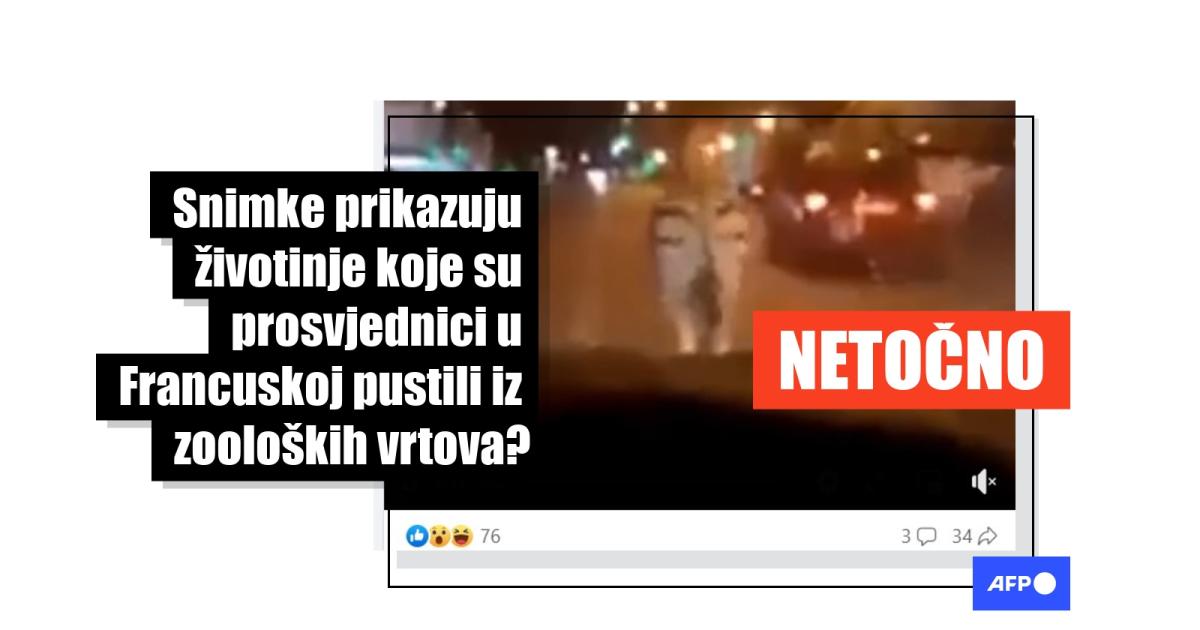 U objavama na hrvatskom na Facebooku ovdje ili ovdje, ili na Telegramu ovdje ili ovdje, tvrdi se da su životinje snimljene u urbanim okruženjima prosvjednici pustili iz zoološkog vrta u Parizu ili nekom drugom, neimenovanom francuskom gradu. Raznolike snimke prikazuju lavove kako hodaju po cesti među automobilima po danu, dok druge prikazuju zebru, nosoroga ili lavove kako se kreću po gradu po noći, uz brojne druge životinje.