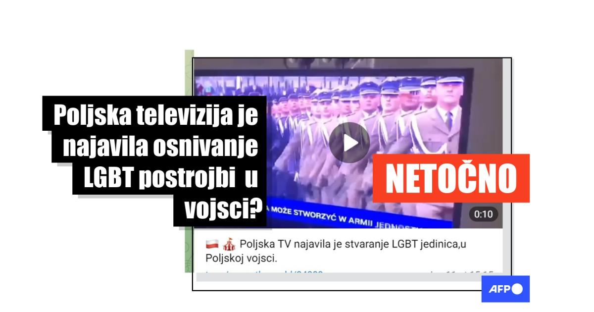 Objave koje prikazuju snimku TV ekrana i ono što izgleda kao TV reportaža s vojnicima koji hodaju u uniformama podijeljene su na Telegramu, Twitteru i Facebooku sredinom lipnja 2023. Na ekranu je prikazan logotip TVP1, kanala poljske državne televizije, a u tekstu na dnu ekrana piše: „Poljska može oformiti LGBT postrojbu u vojsci.“ Čuje se glas naratora koji na poljskom kaže: „Poljska može oformiti LGBT postrojbu u vojsci. Poljske vlasti nisu protiv formiranja specijalnih vojnih jedinica lezbijki, homoseksualaca, biseksualnih i transrodnih osoba.“