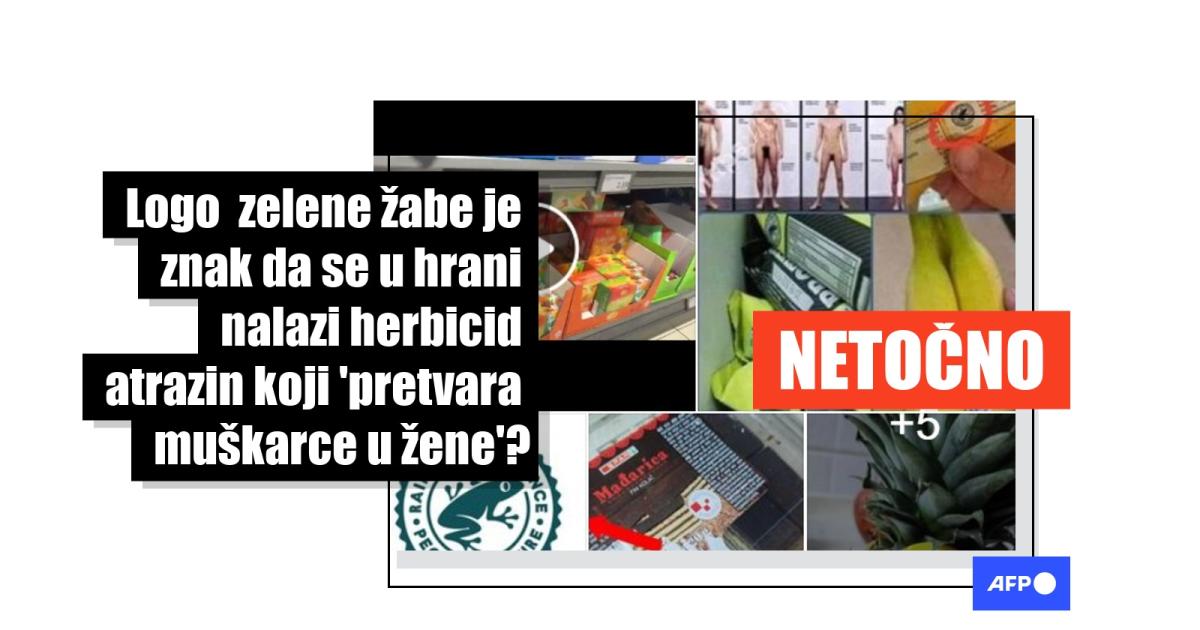 "ATRAZIN MIJENJA SPOL," piše u objavi na hrvatskom koju je objavio srpski korisnik na Facebooku 18. ožujka 2023. s fotografijom nečega što liči na čokoladu s logotipom nevladine organizacije (NVO) Rainforest Alliance na omotu. Prema navodima u objavi, herbicid atrazin najzastupljeniji je u proizvodima "iz tvrtke Rainforest Alliance." Isti tekst i slika podijeljeni su u brojnim objavama u ožujku 2023., uključujući ovdje i ovdje uz sliku drugih proizvoda na kojima se vidi logotip zelene žabe.