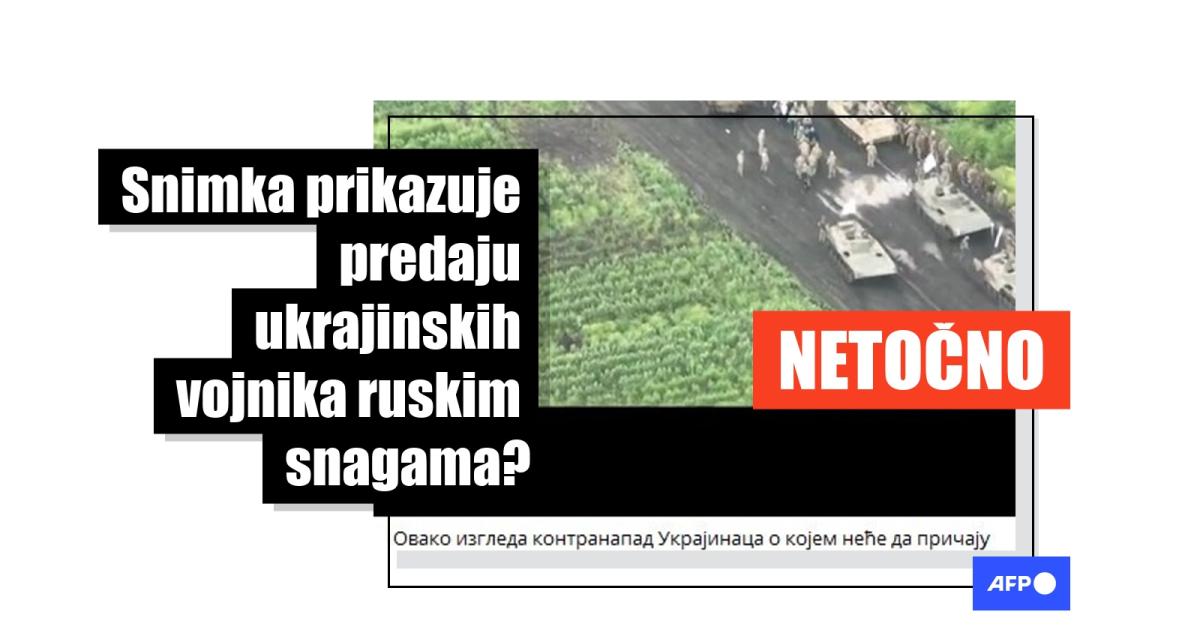 "Ovako izgleda kontranapad Ukrajinaca o kome neće da pričaju u Ukrajini. Okupljaju se u velike kolone pod belom zastavom i predajom spasavaju svoje živote," stoji u opisu snimke objavljene na srpskom na Telegramu 23. srpnja 2023. Ista snimka podijeljena je na Facebooku uz isti opis ili na primjer ovdje uz tvrdnju da je "počela masovna predaja ukrajinskih vojnika" i ovdje na slovačkom.