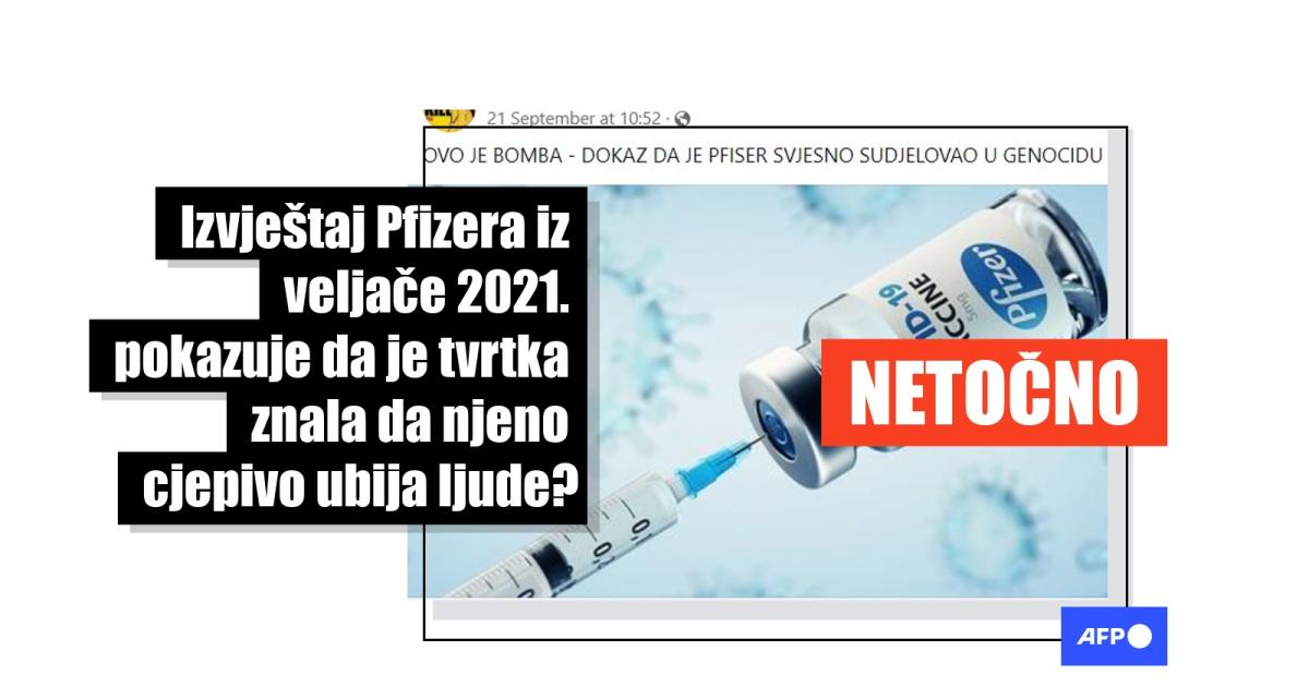 "Ovo je bomba - dokaz da je Pfizer svjesno sudjelovao u genocidu," vrišti objava na Facebooku od 21. rujna 2023. ispisana velikim slovima. Druga tvrdi kako "tajni izvještaj Pfizera pokazuje da je tvrtka od 2021. znala da njezino mRNA cjepivo ubija ljude". Objava na Telegramu od 19. rujna 2023., koja je od tada pregledana više od 2000 puta, jednostavno kaže "Genocid...". Sve ove objave uključuju i poveznicu na članak na hrvatskom od 19. rujna 2023. u kojem se tvrdi kako su "mRNA injekcije uzrokovale više od 1200 prijavljenih smrti i desetke tisuća prijavljenih neželjenih posljedica, samo unutar prva dva mjeseca otkad je pušteno sredinom prosinca 2020.".