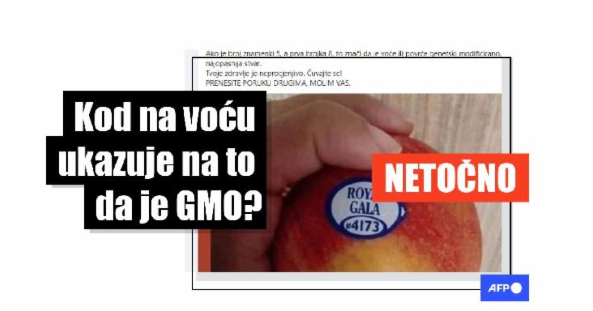 "Ove naljepnice na voću (većinom uvezeno) znate li što znače?" piše u objavi na hrvatskom objavljenoj na Facebooku 15. studenog 2023. i podijeljenoj preko 1.800 puta. U objavi je slika jabuke u nečijoj ruci na kojoj se vidi naljepnica s natpisom: "Royal Gala #4173". Dalje se tvrdi da "ako postoje 4 znamenke, a prva brojka je 3 ili 4, znači da je ovo voće poprskano pesticidima, mora se dobro oprati prije konzumiranja. Ako je broj znamenki 5, a prva znamenka 9, to znači da je ovo voće ili povrće organsko (i smatra se najboljom vrstom). Ako je broj znamenki 5, a prva brojka 8, to znači da je voće ili povrće genetski modificirano, i to je najopasnija stvar."