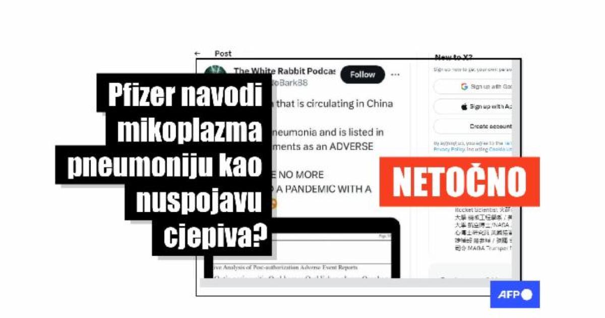 "Pfizer je naveo mycoplasma pneumoniju kao jednu od nuspojava njihovih mRNA... kakva slučajnost," stoji u objavi napisanoj na engleskom i tradicionalnom kineskom od 30. studenog na platformi X, ranije poznatoj kao Twitter.