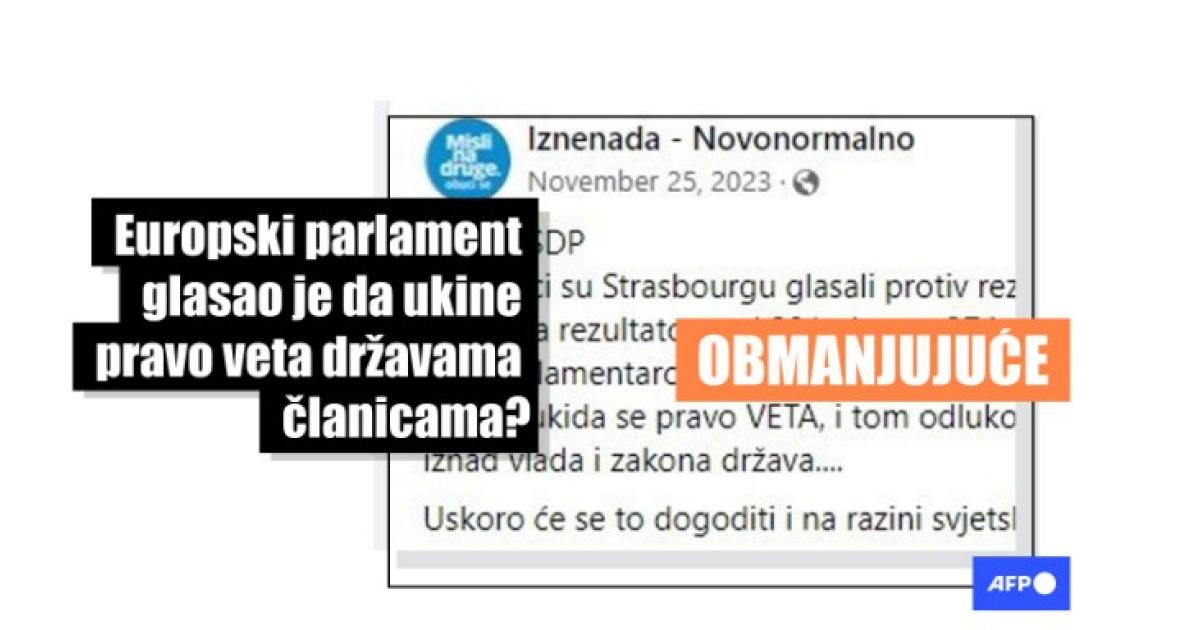 "SDP-ovci su Strasbourgu glasali protiv rezolucije kojom se ukida pravo VETA... Dakle, ukida se pravo VETA, i tom odlukom je parlament EU službeno postao jedna vlada koja je iznad vlada i zakona država....," piše u ovoj Facebook objavi na hrvatskom od 25. studenog 2023. Isto se tvrdi i u objavi ovdje i ovdje.