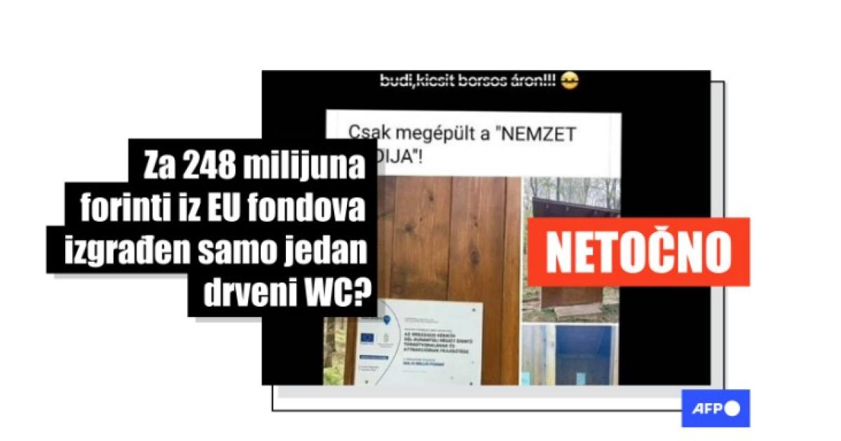 "Drveni WC izgrađen za 248 milijuna forinti iz EU fondova" - stoji u objavi na mađarskom na Facebooku podijeljenoj više od 10.000 puta od 1. svibnja 2024. Fotografija u objavama prikazuje kompostni WC u šumi s informativnim natpisom uobičajenim za projekte financirane kroz EU fondove. Dok su neki korisnici isticali da na natpisu stoji da je novac (268 milijuna, a ne 248 kako stoji u objavi) utrošen u veći projekt za cijelu planinarsku stazu, drugi su, čini se, vjerovali da je to stvarno WC na kojeg su potrošili stotine milijuna forinti (oko 695.000 eura).