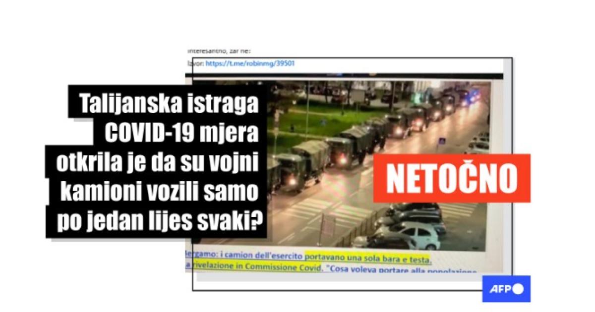 Te i slične objave podijeljene su više od 140 puta na Facebooku otkad su prvo postavljene. Međutim, tvrdnje u njima su netočne. Ne radi se o službenom nalazu aktualne istrage povjerenstva talijanskog parlamenta, već o izjavi dužnosnika policijskog sindikata, koji je u odvojenom intervjuu priznao da nema dokaza za svoje tvrdnje. Postoje fotografski dokazi da su neki kamioni prevozili više lijesova, a AFP je izvijestio da su prevozili do 70 dnevno.