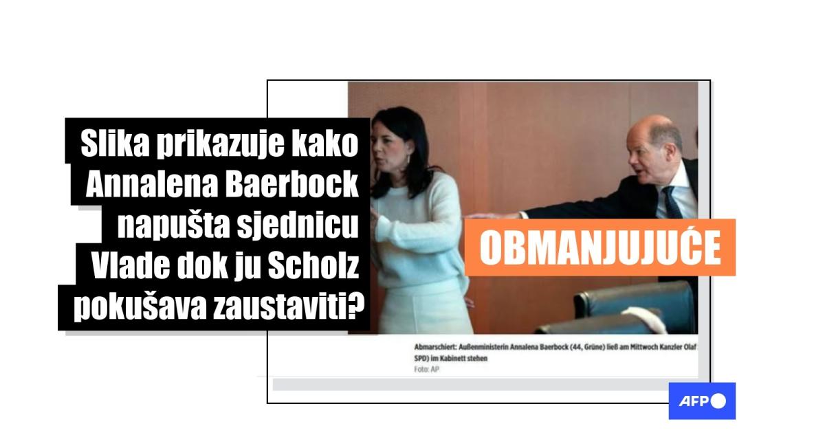 AFP je pronašao originalnu sliku i utvrdio da prikazuje sasvim drugačiju scenu: ministrica Baerbock razgovara s drugim ministrom 15. siječnja 2025., prije početka redovite sjednice Vlade. Kancelar Scholz nije je pokušavao zaustaviti, već joj je pokušao skrenuti pozornost kako bi sastanak započeo, objasnio je AFP-ov fotograf koji je bio prisutan.
