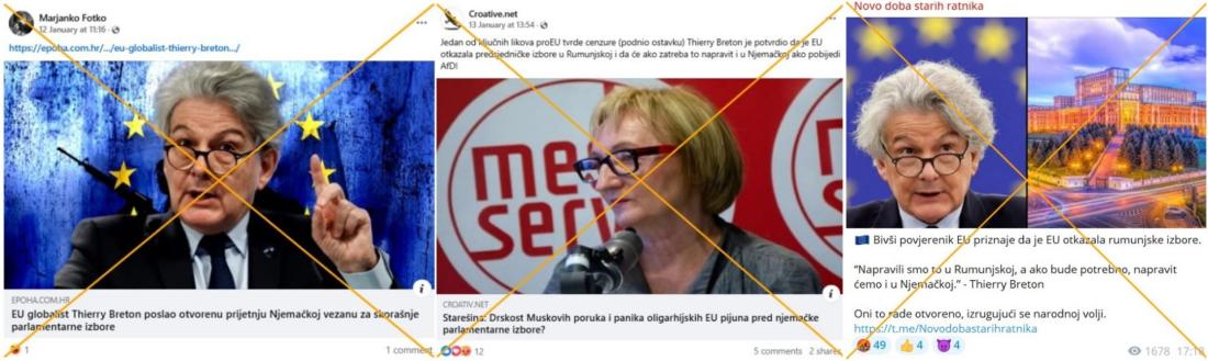 U članku na portalu Epoha, čije je objave AFP više puta opovrgavao (na primjer ovdje, ovdje ili ovdje), umetnuta je i objava na X-u Elona Muska, koji otvoreno podržava njemačku krajnje desničarsku stranku AfD (arhivirano ovdje). U toj objavi nalazi se citat Thierryja Bretona i isječak snimke njegovog intervjua na francuskom kanalu RMC, u kojem je izjavio: "To smo učinili u Rumunjskoj, učinit ćemo to i u Njemačkoj ako bude potrebno."