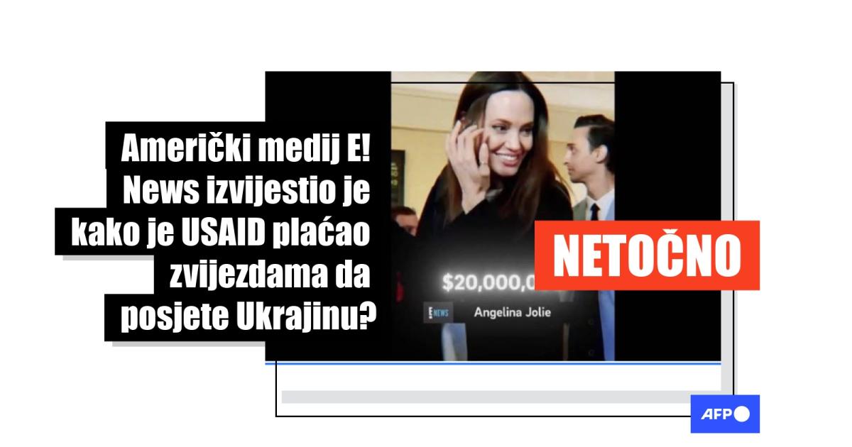 "Vjerovatno ste pretpostavljali prije, ali sada je otkriveno - koliko su holivudske zvijezde plaćene da 'vole' Ukrajinu", napisao je korisnik na Facebooku na hrvatskom 6. veljače 2025., u opisu fotografije koja izgleda kao snimka zaslona TV priloga kanala E! News. "USAID je sponzorirao posjete američkih slavnih osoba Ukrajini kako bi podržali režim Zelenskog", tvrdi isti korisnik, navodeći i iznose koje su pojedini glumci navodno dobili za svoje posjete - Jean -Claude Van Damme 1,5 milijuna dolara, Ben Stiller četiri milijuna, Sean Penn pet milijuna, Orlando Bloom osam milijuna, te Angelina Jolie 20 milijuna dolara.