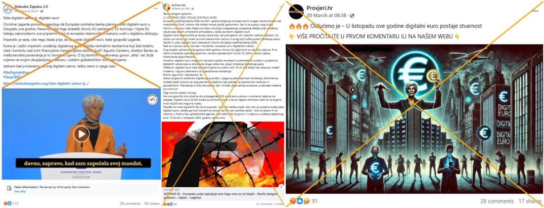 Tvrdnje da ECB uvodi digitalni euro u listopadu 2025. podijeljene su više od 200 puta na Facebooku na hrvatskom jeziku tijekom ožujka 2025., a također su se proširile i na drugim jezicima, poput češkog, slovačkog, francuskog, njemačkog ili španjolskog.