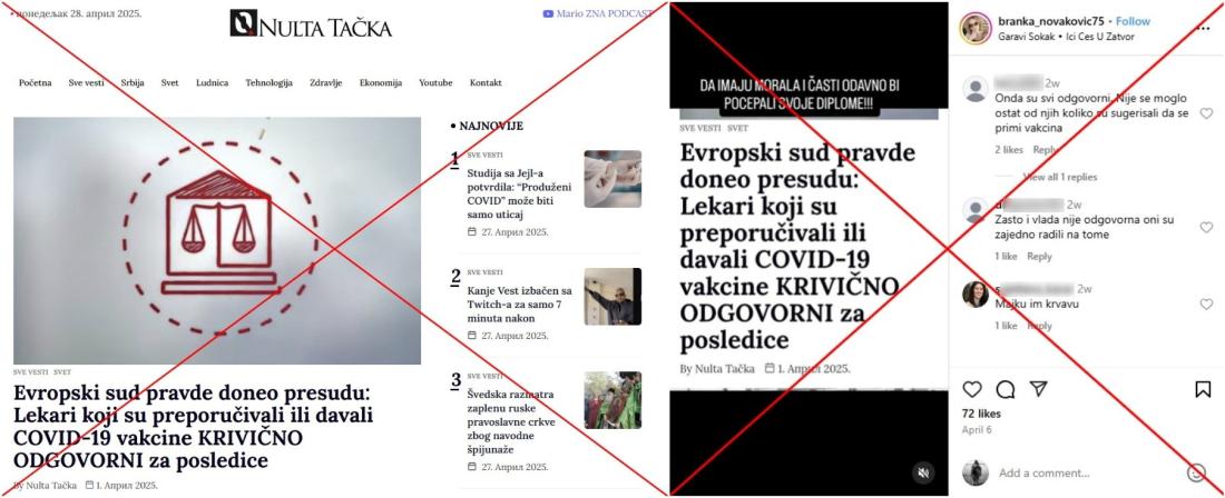 "Evropski sud pravde doneo presudu: Lekari koji su preporučivali ili davali COVID-19 vakcine KRIVIČNO ODGOVORNI za posledice," piše u naslovu članka objavljenog 1. travnja 2025. i podijeljenog desetke puta na društvenim mrežama uključujući Facebook, Telegram i platformu X. U tekstu se tvrdi da je Sud Europske unije (ili Europski sud pravde), institucija EU u Luksemburgu, objavio u 2025. godini "presudni pravni preokret koji bi mogao promeniti medicinsku praksu."