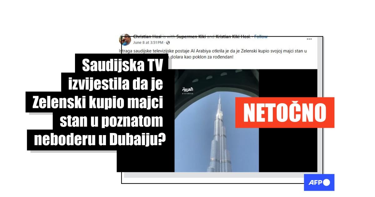 "Saudijska državna televizija Al-Arabiya otkrila je da je Zelenski kupio svojoj majci stan u neboderu Burj Khalifa za 3,2 milijuna dolara za njezin rođendan," stoji u objavi na Facebooku na hrvatskom jeziku od 8. lipnja 2025. Uz objavu je i kratka snimka, na arapskom i engleskom jeziku, napravljena tako da nalikuje vijestima saudijske televizije. U njoj se navodi da se stan od 2.000 kvadratnih metara nalazi na 11. katu nebodera od 163 kata visokog 828 metara te da ga je ukrajinski predsjednik kupio u rujnu 2024. kao poklon za 74. rođendan svoje majke.