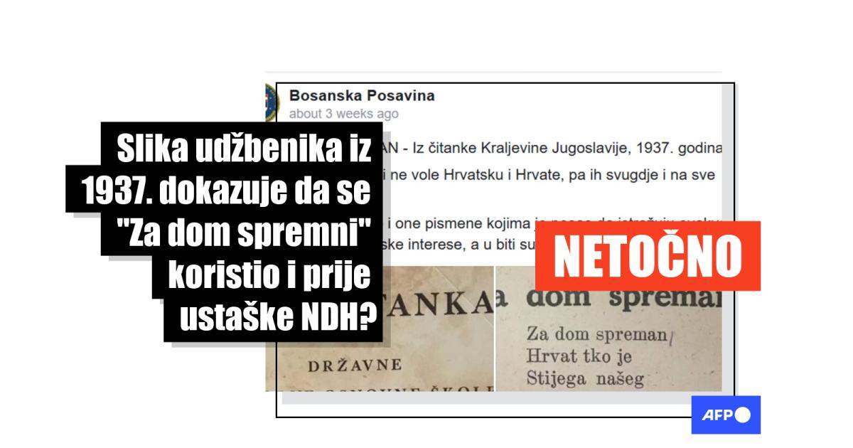 "ZA DOM SPREMAN - Iz čitanke Kraljevine Jugoslavije, 1937. godina," piše u objavi na Facebooku od 25. srpnja 2025. U objavi se nalaze dvije slike: prva prikazuje stranu knjige na kojoj se može pročitati: "Prva čitanka za državne narodne osnovne škole u Kraljevini Jugoslaviji, treće izdanje" koju je priredio dr. Sigismund Čajkovac. Može se vidjeti datum odobrenja ministarstva prosvjete "1937"; na drugoj slici nalazi se tekst pjesme pod naslovom "Za dom spreman."
