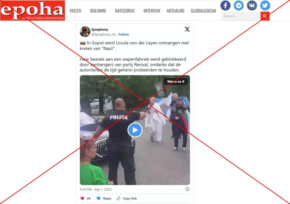 Predsjednica Europske komisije Ursula von der Leyen posjetila je bugarsku tvornicu oružja 31. kolovoza 2025. godine. Prije njenog dolaska, ispred tvornice u Sopotu okupile su se pristaše krajnje desničarske stranke Vazrazhdane, na čelu s vođom Kostadinom Kostadinovim, kako bi protestirali protiv njenog posjeta. Ubrzo nakon toga, na društvenim mrežama počela je kružiti snimka na kojoj se vide demonstranti kako pokušavaju spriječiti prolazak crnog automobila, uz netočnu tvrdnju da se von der Leyen nalazila u vozilu. Zapravo, podaci o letu, fotografije i snimke potvrđuju da šefica Europske komisije u to vrijeme još nije stigla u Bugarsku već sletjela je oko tri sata kasnije. Dužnosnici su također rekli AFP-u da nije bila u vozilu.