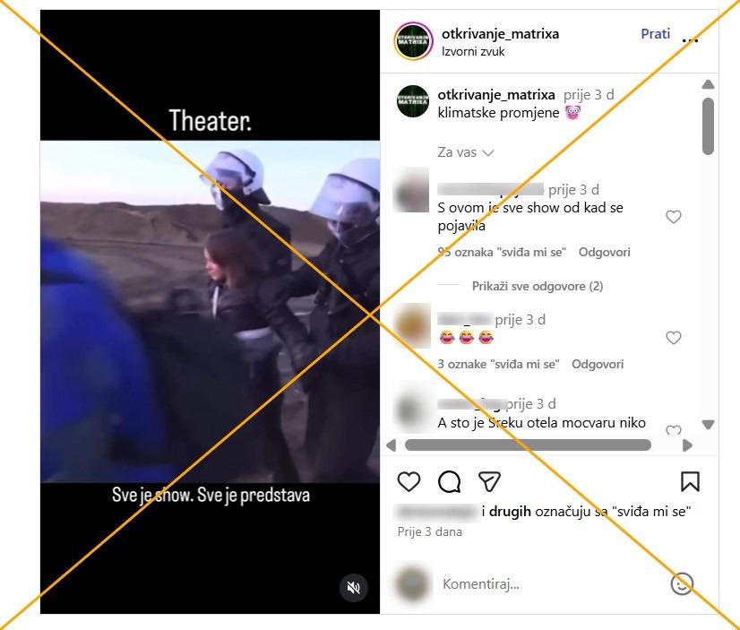 "Sve je show. Sve je predstava", piše u opisu videa objavljenog 10. studenog 2025. na Instagramu. Video je do sada pregledan preko šesdeset tisuća puta i u njemu se pojavljuje Greta Thunberg dok je drže policajci, a ona se pritom smije dok je odvode. Isti video objavljen je i na korisnikovom Facebook profilu.