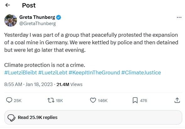 Dana 18. siječnja 2023. Greta Thunberg se izjasnila o prosvjedu putem svog profila na platformi X, opisujući događaje iz svoje perspektive. Napisala je: "Jučer sam bila dio skupine koja je mirno prosvjedovala protiv proširenja rudnika ugljena u Njemačkoj. Policija nas je opkolila i privela, no kasnije iste večeri smo pušteni."