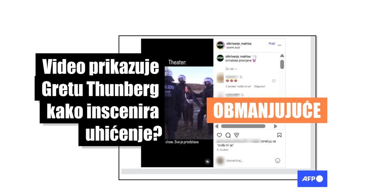 Greta Thunberg švedska je klimatska aktivistica koja je pokrenula globalni pokret "Fridays for Future" i postala simbol mladenačkog zalaganja za klimatsku pravdu, ali i česta meta dezinformacija. Na internetu kruži objava s videom na kojemu policija u Njemačkoj privodi Thunberg, uz tvrdnju da je sve bilo inscenirano radi publiciteta. Međutim, njemačka policija potvrdila je za AFP da incident u njemačkom selu Lützerath 2023. godine nije bio insceniran. Sama Thunberg to je potvrdila i na platformi X, a to se može vidjeti i u više videa koje su objavili relevantni mediji.