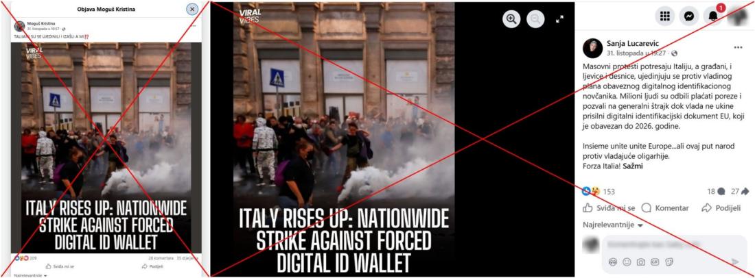 Europska unija iznijela je zahtjev da njezine države članice do kraja 2026. godine svojim građanima ponude europski digitalni identifikacijski novčanik za pohranu digitalnih verzija službenih dokumenata. Iako je ovaj sustav dosad izazvao vrlo malo protivljenja, u viralnim objavama na društvenim mrežama iz listopada 2025., u kojima se dijele fotografiju prosvjednika izloženih suzavcu, tvrdi se da je uvođenje tog sustava izazvalo masovne demonstracije diljem Italije. Međutim, istraga AFP-a pokazala je da fotografija prikazuje prosvjed protiv cijepljenja iz 2021. godine u Italiji. Ured AFP-a u Rimu također je potvrdio kako nije bilo izvješća o masovnim prosvjedima protiv digitalne identifikacije u Italiji.