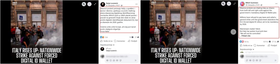 "Masovni protesti potresaju Italiju, a građani, i ljevice i desnice, ujedinjuju se protiv vladinog plana obaveznog digitalnog identifikacionog novčanika," stoji u objavi na Facebooku, objavljenoj 31. listopada 2025. "Milioni ljudi su odbili plaćati poreze i pozvali na generalni štrajk dok vlada ne ukine prisilni digitalni identifikacijski dokument EU, koji je obavezan do 2026. godine."