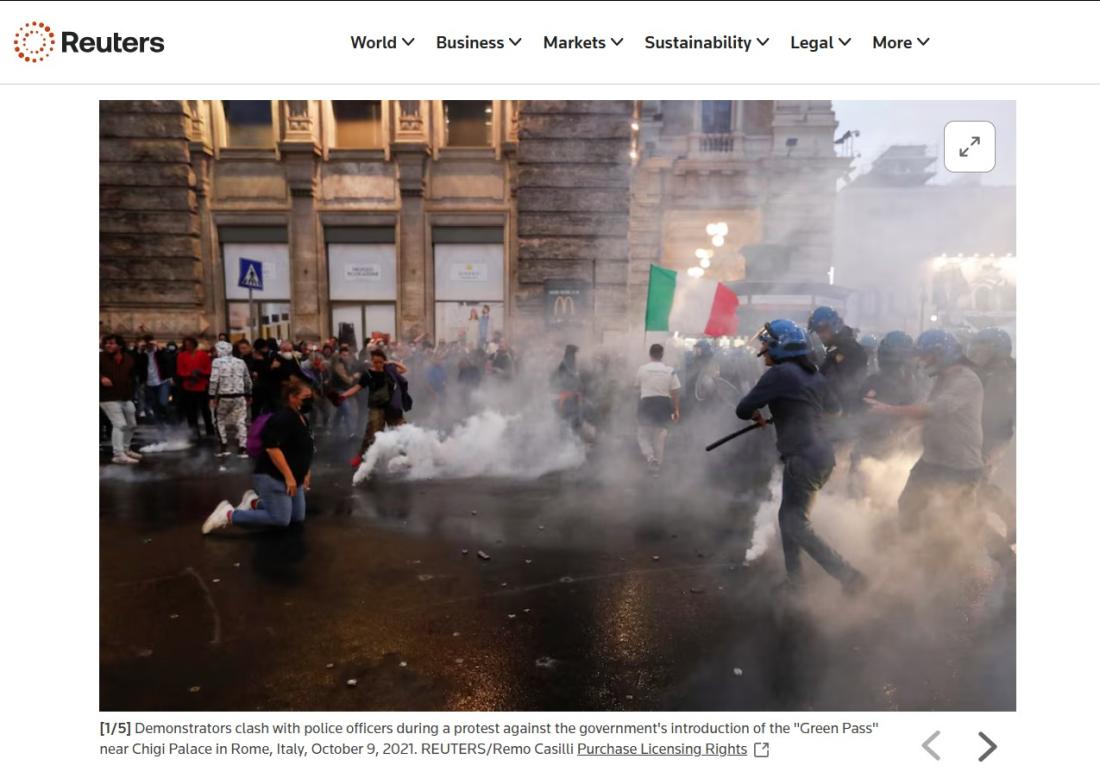 Fotografija prikazuje sukobe između policije i prosvjednika koji su se protivili obveznom uvođenju tzv. zelenih propusnica, inicijative osmišljene za poticanje cijepljenja protiv covida-19 na svim radnim mjestima.
