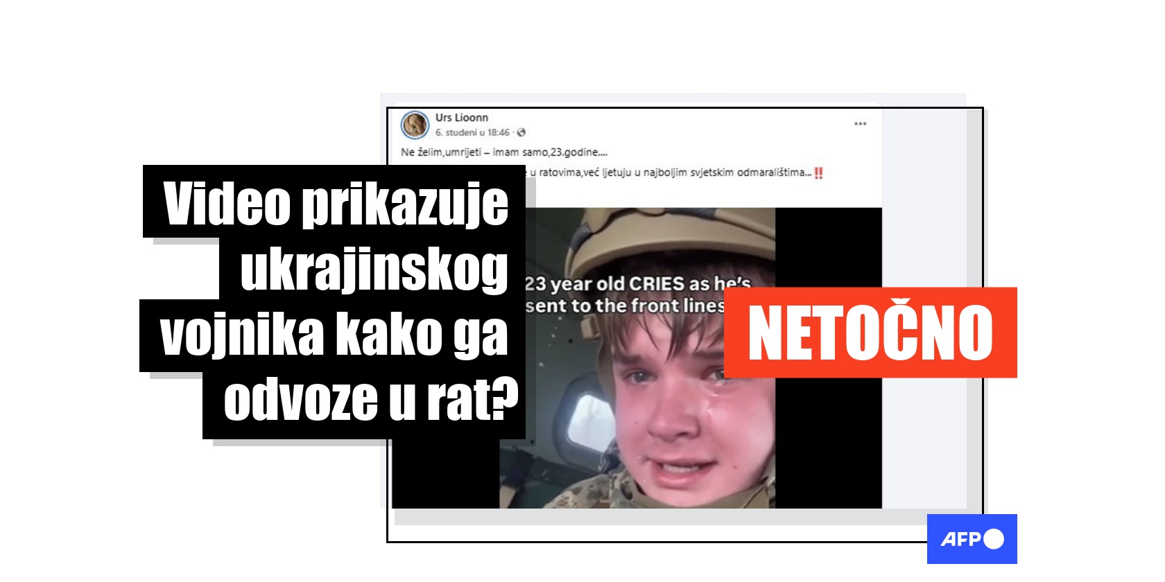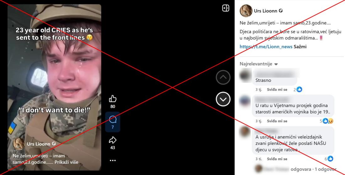 Mladić mokre kose, s kacigom na glavi i u vojnoj uniformi, sjedi na stražnjem sjedalu automobila. Suze mu klize niz obraze. "Mobiliziran sam. Šalju me u Chasiv Yar (grad u Ukrajini)," govori na ukrajinskom, dok tekst u videu nudi engleski prijevod. Kroz mali prozor može se vidjeti pust krajolik. "Ne želim umrijeti – imam samo 23.godine… Djeca političara ne bore se u ratovima,već ljetuju u najboljim svjetskim odmaralištima.", piše u opisu objave na Facebooku od 6. studenoga 2025. godine, koja je podijeljena više od 40 puta.