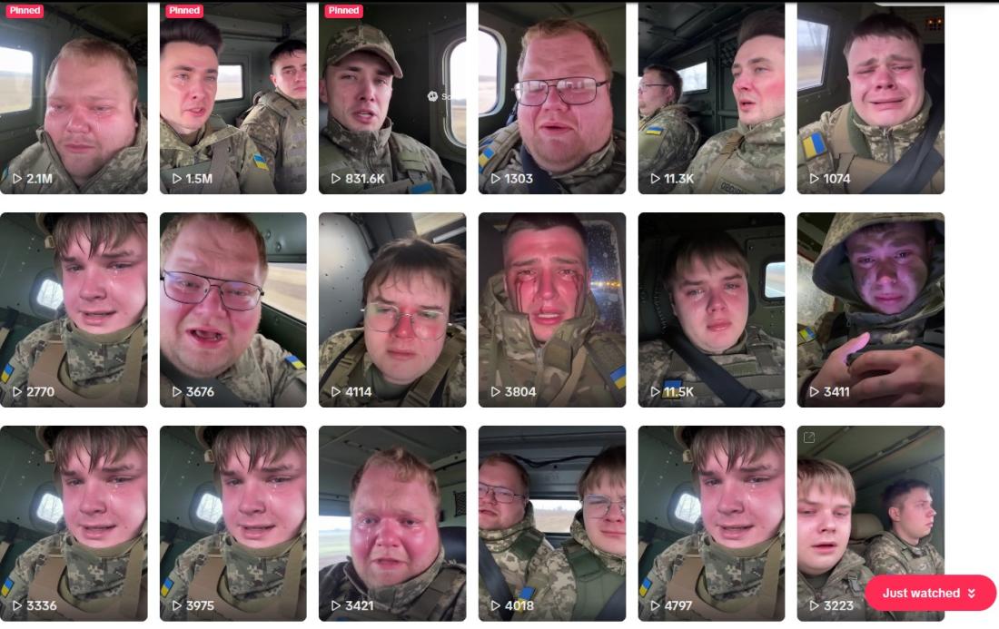 Obrnuta pretraga slika sa snimkama iz isječka dovela je do TikTok računa "@fantomoko", čije se ime također može vidjeti u dijeljenom videu. Na tom su profilu objavljeni brojni videi vojnika koji navodno plaču, s ukrajinskim oznakama na rukavima uniforme. Neki su imali vodeni žig Sora, što upućuje na to da su stvoreni pomoću aplikacije američke softverske tvrtke OpenAI. Ostali su videi pokazivali očite znakove manipulacije slikom te su prikazivali, primjerice, vojnika kojem su suze izgledale poput kapljica krvi, kao što se vidi na četvrtom videu slijeva u drugom redu.