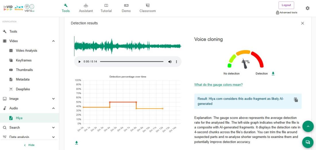 Uz pomoć alata deepfake-total.com, Fraunhofer Instituta za primijenjenu i integriranu sigurnost, AFP je uspio potvrditi s 53,4 % sigurnosti da je zvučni zapis videa, koji se masovno dijelio na internetu, bio manipuliran.