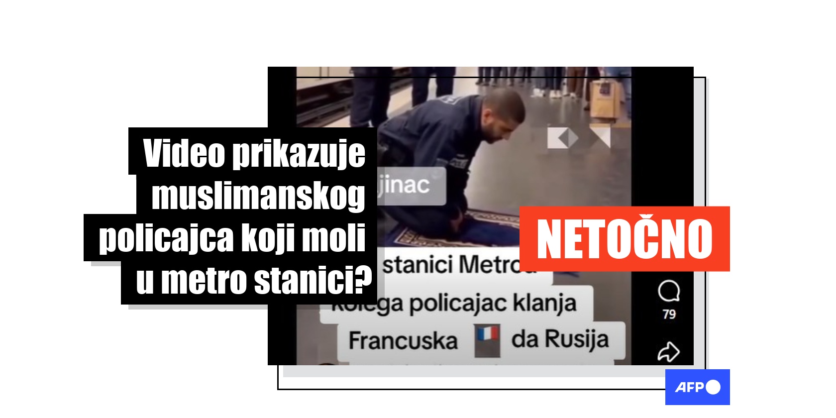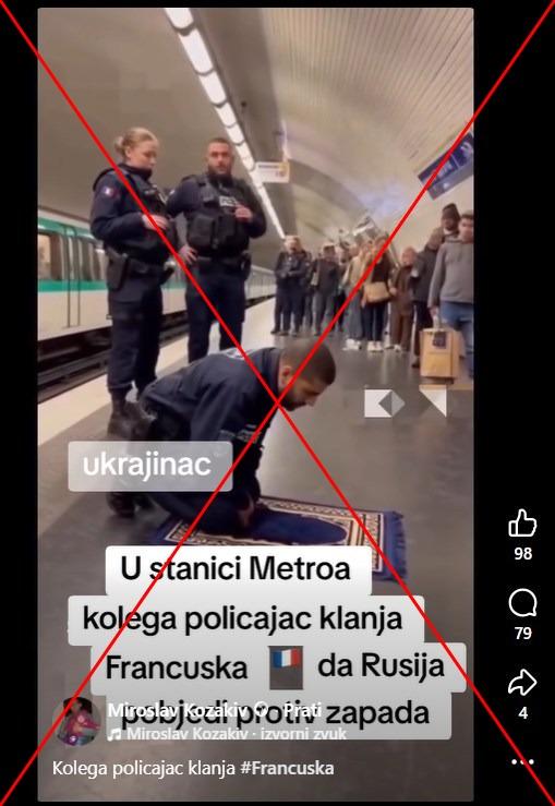 "Kolega policajac klanja," piše u opisu objave na Facebooku, objavljene 12. prosinca 2025. godine i pregledane gotovo 40 tisuća puta. Tvrdnja je objavljena uz 10-sekundi dug video koji prikazuje francuskog policajca kako se moli u metrou dok ga njegove kolege čekaju da završi s molitvom. Na videu se može pročitati opis "U stanici metroa kolega policajac klanja Francuska da Rusija pobjedi protiv zapada."