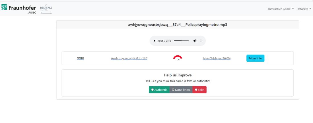 AFP je također analizirao zvuk videa pomoću alata Deepfake Total, koji otkriva audio deepfake, i dobio je ocjenu 96%, što znači da je vrlo vjerojatno da je glazba stvorena umjetnom inteligencijom.