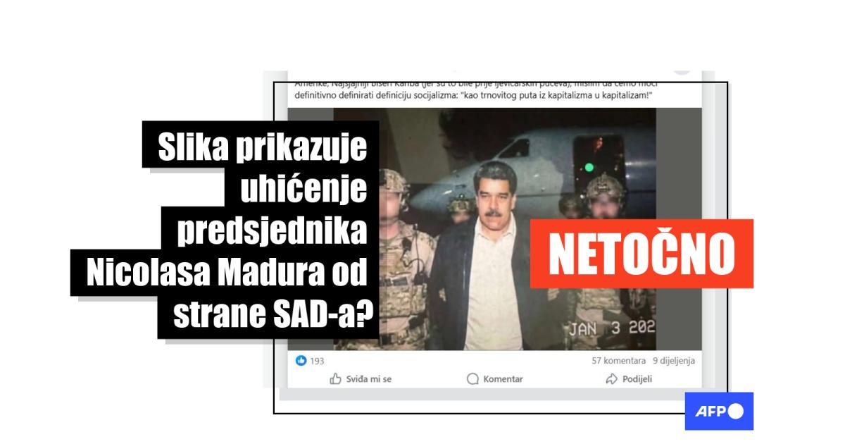 Venezuelanski predsjednik Nicolas Maduro i njegova supruga Cilia Flores uhićeni su od strane američkih specijalnih snaga u ranim jutarnjim satima 3. siječnja 2026. godine, usred bombardiranja koje je iznenadilo stanovnike glavnog grada Caracasa. Nakon američke operacije na društvenim mrežama je na više jezika, uključujući hrvatski, postala viralna slika koja navodno prikazuje Madurovo uhićenje. Međutim, slika nije autentična. AFP je utvrdio da je generirana umjetnom inteligencijom (AI), što potvrđuju vizualne nepravilnosti, alati za otkrivanje AI sadržaja te intervju s autorom slike.