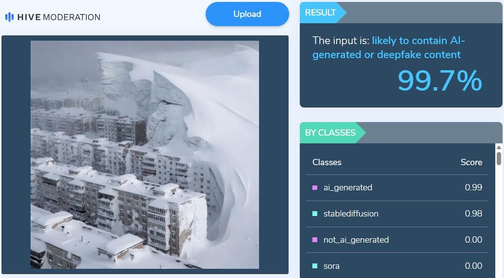 Vizualne nedosljednosti ukazuju na to da slike nisu autentične. Snijeg izgleda neuobičajeno glatko i simetrično ili se prikazuje kako tvori nagle vertikalne zidove koji ne odgovaraju načinu na koji se snijeg nakuplja u stvarnim uvjetima. Arhitektonski detalji na prozorima i balkonima također pokazuju nedosljednosti i iskrivljenja tipično za slike generirane AI-jem.