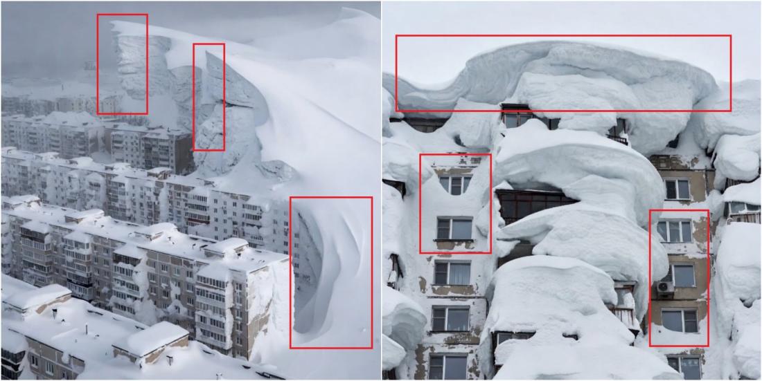 Mnoge objave prikazuju zbirku četiri ili pet istih slika stambenih zgrada gotovo zatrpanih ogromnim snježnim nanosima. Stambene blokove okružene glatkim, oblikovanim snijegom koji stvara valove, a u nekim slučajevima doseže visinu višekatnih zgrada. Na drugoj slici vidimo snijeg koji se slikovito slijeva niz balkone stambenih zgrada.