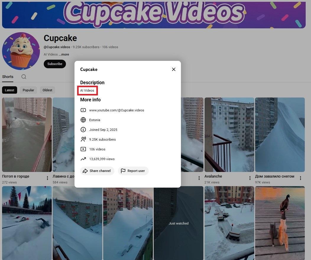 Video, naslovljen "Snježna mećava", na YouTubeu je označen kao "izmijenjeni ili sintetički sadržaj", a u opisu kanala također piše: "AI Videos."