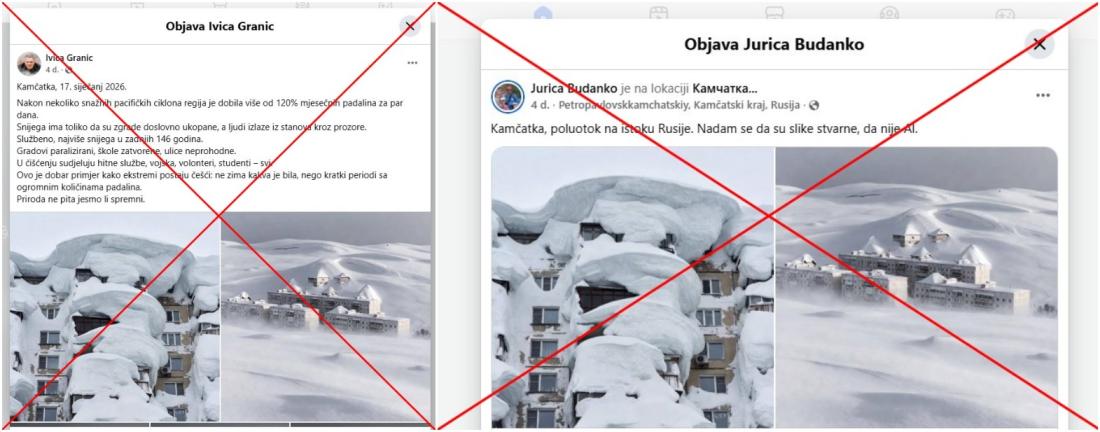 Ruski poluotok Kamčatka doživio je u siječnju 2026. neuobičajeno obilne snježne padaline koje su zatrpale automobile i dosezale do drugog kata zgrada. Dramatične slike i videozapisi ubrzo su preplavili društvene mreže, uz tvrdne da prikazuju ekstremnu vremensku nepogodu. No, istraga AFP-a otkrila je da su mnoge od tih viralnih slika generirane umjetnom inteligencijom i da su pretjerale u prikazu vremenskih uvjeta.