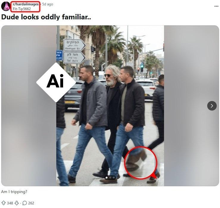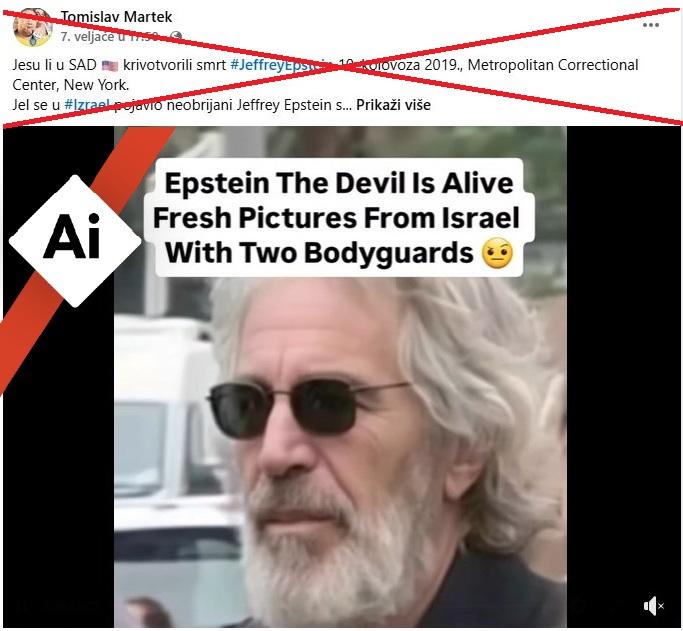Dok američko Ministarstvo pravosuđa objavljuje kompromitirajuće dokumente povezane s osuđenim seksualnim prijestupnikom Jeffreyjem Epsteinom, koji je 2019. godine počinio samoubojstvo čekajući suđenje. Korisnici društvenih mreža tvrde da se pojavila nova fotografija navodno snimljena u Izraelu na kojoj je pokojni financijer živ, s dugom kosom i bradom. Međutim, istraga AFP-a utvrdila je da fotografija nije original te potječe s Reddit kanala posvećenog AI sadržaju. Fotografija sadrži vodeni žig Googleova Geminija, kao i druge pokazatelje da je izrađena uz pomoć umjetne inteligencije.