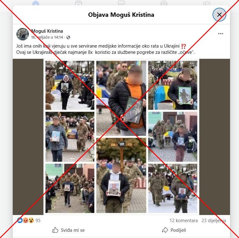 "Još ima onih koji vjeruju u sve servirane medijske informacije oko rata u Ukrajini. Ovaj se Ukrajinski dječak najmanje 8x koristio za službene pogrebe za različite ‘očeve’," piše u opisu objave na Facebooku, objavljenje 16. veljače 2026. godine. Objava je podijeljena dvadesetak puta. Ispod teksta nalazi se kompilacija fotografija koja prikazuje istog tinejdžera kako prisustvuje osam različitih sprovoda, na kojima nosi portret preminule osobe.