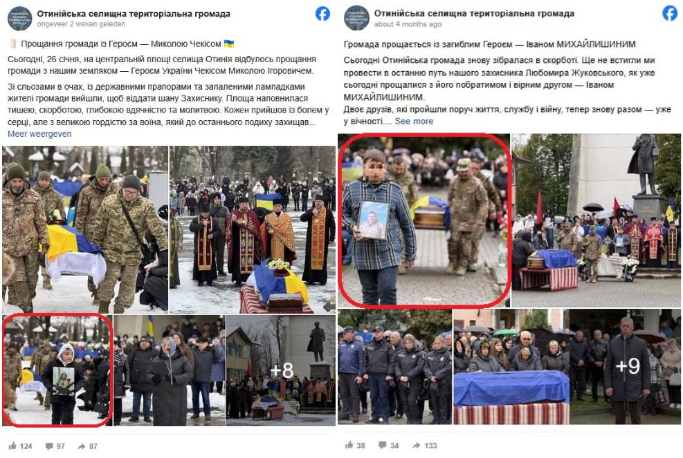 Korištenjem obrnute pretrage slika za svaku od osam fotografija utvrđeno je da su snimljene u različitim prilikama, tijekom komemoracija za ukrajinske vojnike iz Otyniie, ruralnog naselja u Ivano-Frankivskoj oblasti, koji su poginuli u borbi. Sve fotografije objavljene su između listopada 2025. i siječnja 2026. na službenoj Facebook stranici Teritorijalne zajednice naselja Otyniia, koja je organizirala ceremonije (1, 2, 3, 4, 5, 6, 7, 8).