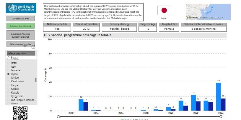 Na službenoj internetskoj stranici WHO-a tablica prikazuje podatke o obuhvatu HPV cijepljenja u Japanu, uključujući broj djevojčica koje su primile jednu dozu te onih koje su završile cijeli ciklus cijepljenja (arhivirano je ovdje). Podaci pokazuju primjetan porast procijepljenosti posljednjih godina.
