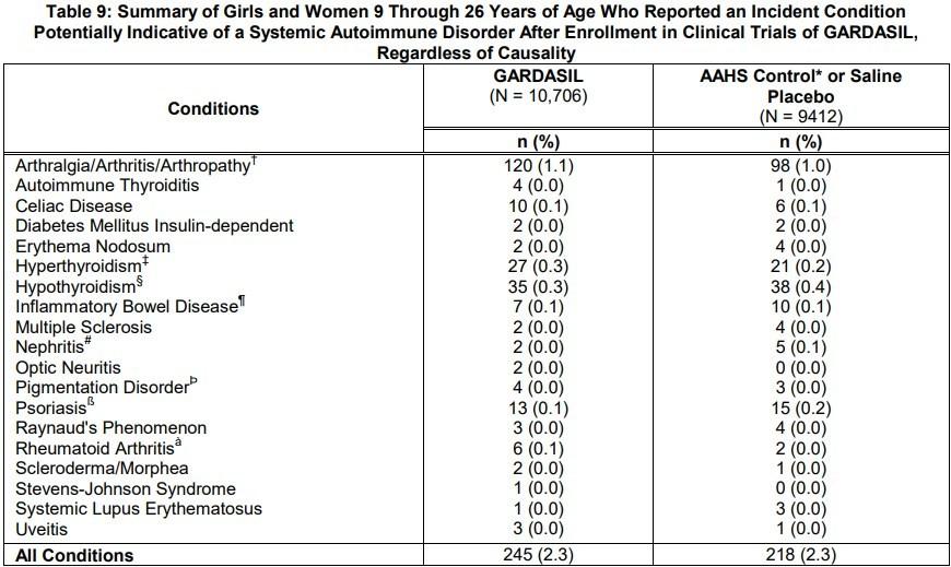 To je, zapravo, jasno iz samog naslova tablice, koji Siri nije spomenuo: "Sažetak djevojaka i žena u dobi od 9 do 26 godina koje su prijavile incidentno stanje potencijalno indikativno za sistemski autoimuni poremećaj nakon uključenja u klinička ispitivanja cjepiva Gardasil, neovisno o uzročnosti ".