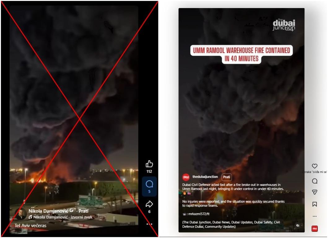 U objavi se navodi da video prikazuje požar u skladištima u industrijskoj zoni Umm Ramool u Dubaiju te se kao izvor snimke navodi korisnik TikToka koji ju je objavio istoga dana (arhivirano je ovdje).