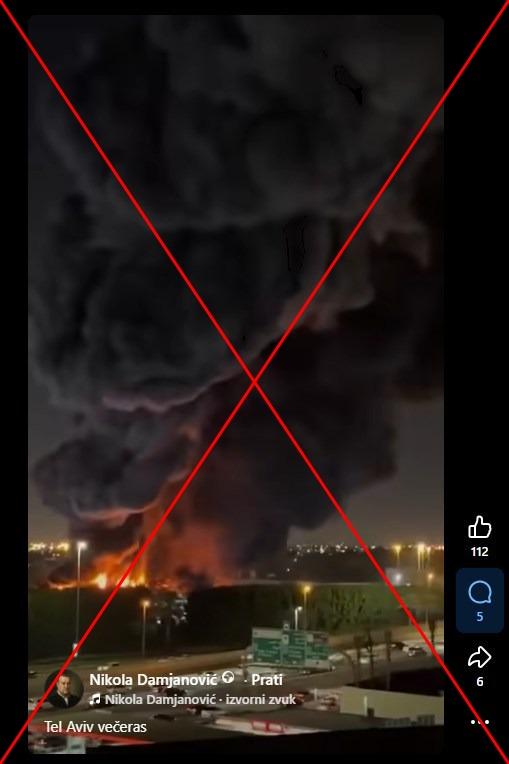 "Tel Aviv večeras ," piše u opisu objave na Facebooku od 1. ožujka 2026. godine uz video koji prikazuje stup gustog crnog dima kako se diže iz zapaljene zgrade uz autocestu. Objava je od tada pregledana preko 2,8 tisuća puta.