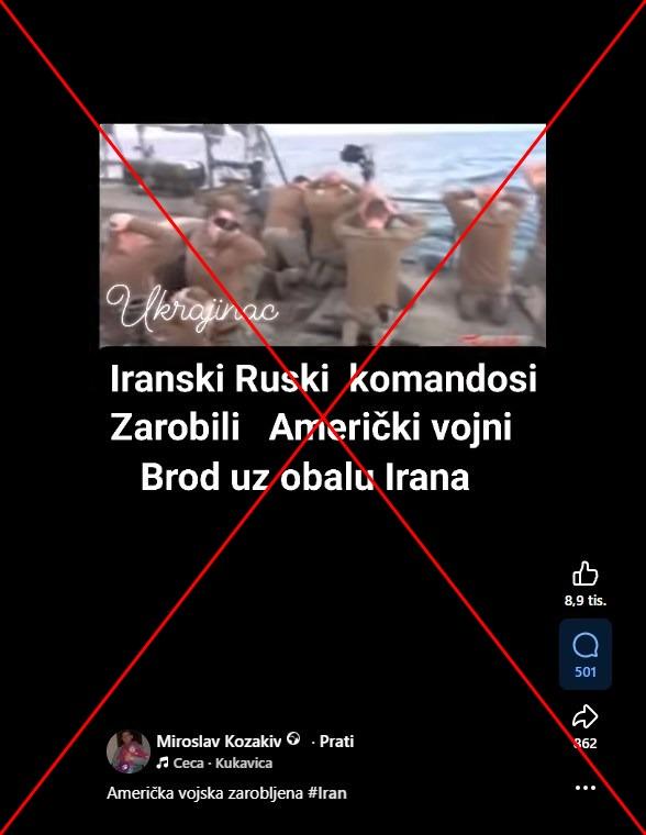 "Američka vojska zarobljena," piše u opisu objave na Facebooku od 1. ožujka 2026. godine. Objava sadrži video koji prikazuje vojnike na brodu, a u nekim se scenama vidi i kako sjede u prostoriji. Video također uključuje tekst na zaslonu koji glasi: "Iranski Ruski komandosi Zarobili Američki vojni Brod uz obalu Irana."